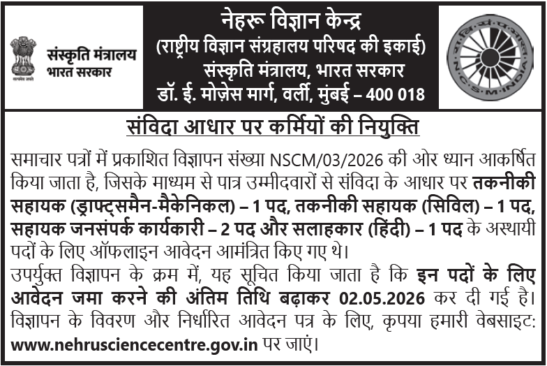 1. | विज्ञापन संख्या. NSCM/03/2026 | नेहरू विज्ञान केंद्र, मुंबई में संविदा आधार पर विभिन्न अस्थायी पदों पर नियुक्ति। (तिथि बढ़ा दी गई है) | |