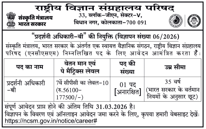 2. | विज्ञापन संख्या. 06/2026 | भारत सरकार के संस्कृति मंत्रालय के अधीन एक स्वायत्त वैज्ञानिक संगठन, राष्ट्रीय विज्ञान संग्रहालय परिषद (NCSM) में “प्रदर्शनी अधिकारी – B” के पद पर भर्ती के लिए आवेदन आमंत्रित किए जाते हैं। |
