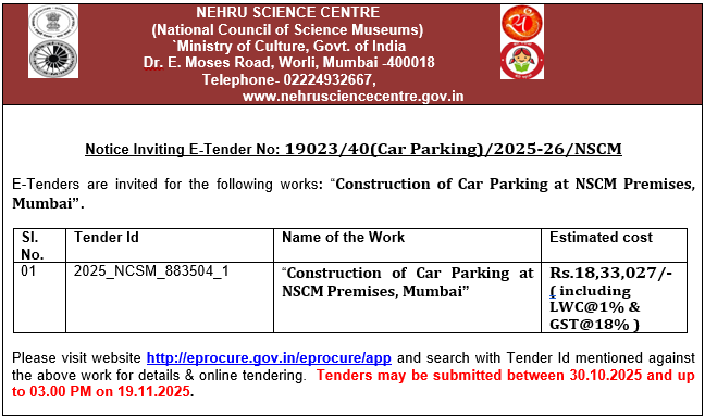निविदा सूचना ई-निविदा विवरण के लिए – यहां क्लिक करें ई-निविदा विवरण के लिए – यहां क्लिक करें शुद्धिपत्र विवरण के लिए – यहां क्लिक करें निविदा दस्तावेज डाउनलोड करने के लिए यहां क्लिक करें।निविदा विवरण डाउनलोड करने के लिए यहां क्लिक करें।—————————————————————————————————————————————————————————————————————————————————————————— —————————————————————————————————————————————————————————————————————————————————————————– ई-निविदा विवरण के लिए – यहां क्लिक करें ई-निविदा विवरण के लिए – यहां क्लिक करें ई-टेंडर विवरण के लिए – यहाँ क्लिक करेंटेंडर नोटिस के लिए – यहाँ क्लिक करें राष्ट्रीय विज्ञान केंद्र, दिल्ली के लिए ऑनलाइन टिकटिंग समाधान हेतु रुचि की अभिव्यक्ति निविदा विवरण डाउनलोड करने के लिए – यहाँ क्लिक करेंनिविदा निर्देश डाउनलोड करने के लिए – यहाँ क्लिक करें