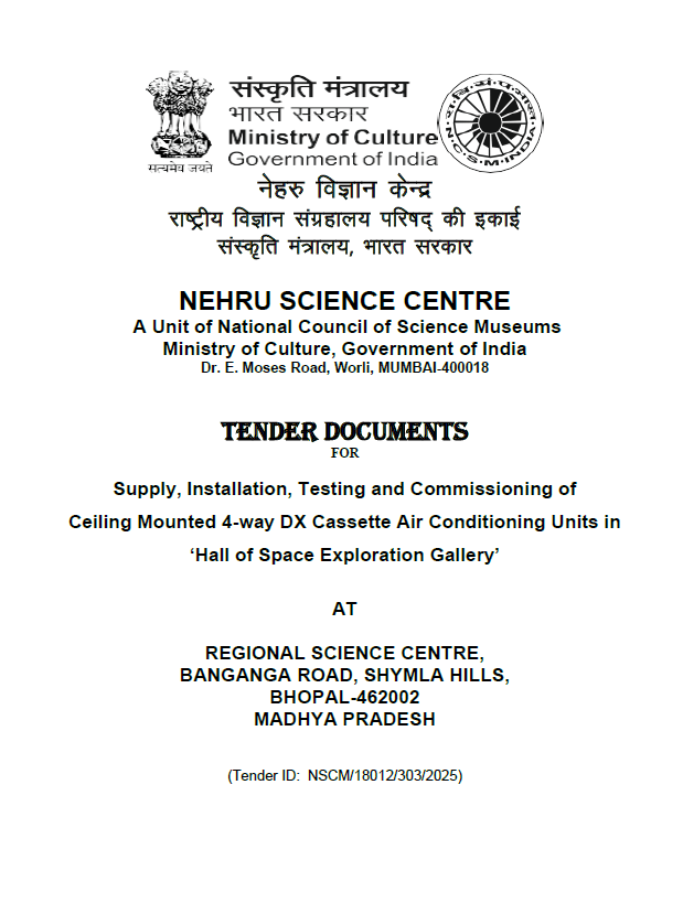 | 1 | 2026_NCSM_897903_1 | 10 फरवरी 2026 | 21 फरवरी 2026 | भोपाल स्थित आरएससी में अंतरिक्ष अन्वेषण गैलरी के हॉल में छत पर लगे 4-वे डीएक्स कैसेट एयर कंडीशनिंग यूनिटों का एसआईटीसी (SITC) | यहाँ क्लिक करें | यहाँ क्लिक करें |