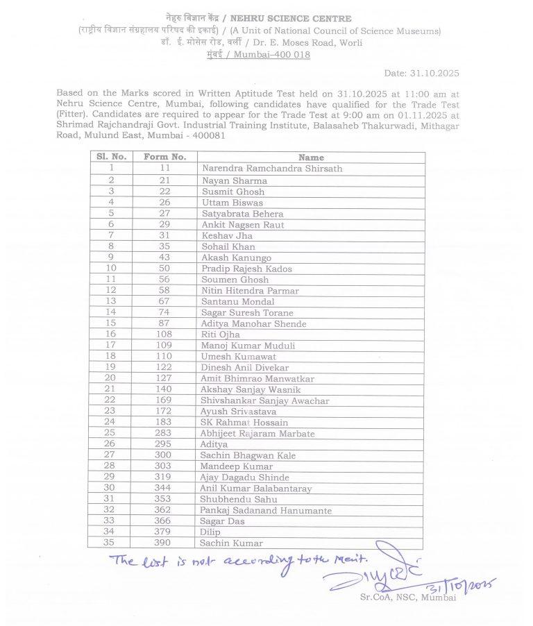 Based on the Marks scored in Written Aptitude Test held on 31.10.2025 at 11:00 am at Nehru Science Centre, Mumbai, following candidates have qualified for the Trade Test (Fitter).