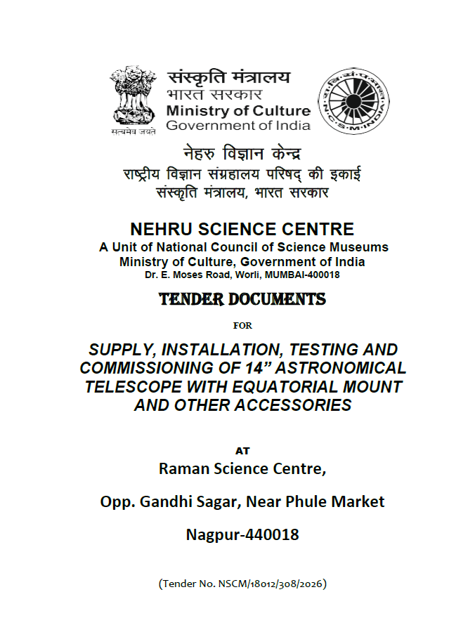 1 | 2026_NCSM_905667_1 | 17-Apr-2026 | 07-May-2026 | SITC of 14 inch Telescope with equatorial mount and other accessories at Raman Science Centre Nagpur | ||